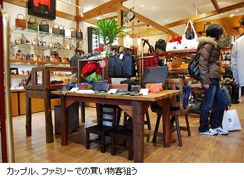 イオンモールの中でユニセックス業態のバッグを展開 バグスカンパニー(群馬・桐生市)は、モギカバン店(同)の別会社を息子の茂木憲さんが買い取り、独立したバッグ専門店。現在、2業態4店舗展開しており、いずれもSCへの出店である。1店舗はレディス業態の「アッシュ」で、地元主導で開発されたコムファーストへ出店する。ほかの3店舗はユニセックス業態の「バグスグルーヴ」で、いずれもイオンモールへの出店である。北関東地区でシェア拡大 バグスカンパニーの店舗展開は当初から大型SC内であり、1号店はイオンモール太田店への出店であった。「実績のない当社が出店できたのは、テナント店の3分の1は地元店で構成するという地元枠があったからと思う。ただし、デベロッパーからはユニセックス業態での出店を要請されました」(茂木憲社長)。 ここでの要請は「ポーター」ブランドをメインに、レディス商品を加えたユニセックス業態でと具体的なもの。地元商店街の中での展開に将来性が見えない状況の中で、郊外の大型SCしか生き残る道はないと考えており、この要請に応えての出店となった。 太田店で取り組んだバグスグルーヴ業態がデベロッパーから評価され、イオンモール高崎店へも出店を要請された。高崎店では「ポーター」に加えて「レッドムーン」の導入をデベロッパーから指定されたが、すでに太田店で扱い始めており、この要請にも応えて出店した。ここではメンズ色をさらに強化してバグスグルーヴ業態で出店した。 イオンモール3号店となる羽生店は、利根川を挟んで太田店と商 圏が重なることになった。「太田店から30〜40分の距離にあり、広域商圏を持つ羽生店とは完全にバッティングしています。しかし、羽生店への出店を取りやめれば、他のチェーン店に太田店のお客も取られることははっきりしており、防御する意味でも2ヵ所に分けてお客の囲い込みを決断しました」。 続きは本誌に