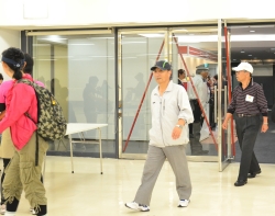 協賛企業ヨネックスのウォーキングシューズ・パワークッションを参加者が試しばき。ヨネックスのスタッフがフィッティングやアドバイスを行った |