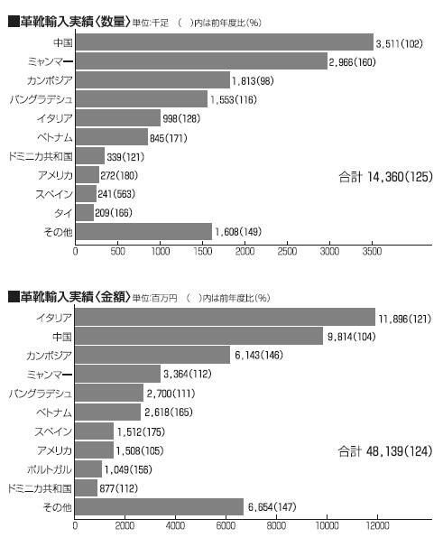 ![]() 革靴の輸入は足数で前上期比25・3%増、金額で同24%増と、ともに2ケタの増加を記録、好調に推移した。金額もほぼ同じような数字を見せて伸びており、円高進行の中でも革靴の平均単価は下がっていないことがわかる。 前上期、1次と2次での輸入足数はほぼ同じだったが、今上期は2次枠での輸入足数が120万足ほど上回っている。金額は1次枠での輸入が2次の倍近くある。これは2次での輸入の多くがLDC(後発開発途上国)からの輸入のため。 国別でみると、上位国ではミャンマーだけが前上期割れで、ほかは前年をクリア。特にカンボジア、ベトナム、ラオスの伸びが大きい。また、EU勢ではスペインが大きく伸ばしている。 続きはFWP本誌に掲載。 |
