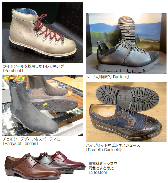 ウエア オケージョンに合わせたコンテンポラリースタイル ファッションのライフスタイル化が進み、機能性を兼ね備えたファッションスタイルがさらに充実している。新たな技術探求で『軽くて温かい』『防水・撥水』商品を発表した「ヘルノ」。インナーに薄いダウンを採用したカーディガンやストレッチレスで200gの超軽量ダウンジャケットを可能にした。 ナイロン素材を減らしカシミアウールフランネル、シルクウールをダウンジャケットに採用した「ブルネロ・クチネリ」の上質カジュアルは、オン・オフ兼用でスマートに着こなせるスタイル。 ![]() シューズ ライトでモダンなハイブリッドシューズ ![]() 重厚なスタイルを保ちつつも軽量。それを可能にしているのがライトソールの採用だ。機能を追求しながらモードを実現する「ヴィブラムソール」は、「ブルネロ・クチネリ」「ブッテロ」「ブルーノ・ボルデーゼ」などファッション系ブランドに人気がある。 “ピレッリ・ラバー”のノウハウを生かした「Pゼロ」では、雪道や凍った道でもグリップ性を発揮するパフォーマンス性のあるシューズコレクションを発表した。 「ハリーズ・オブ・ロンドン」ではサイドゴアブーツが人気で、「トリッカーズ」でもレディスともに人気アイテムだという。 ![]() ![]() ![]() ファッション性をアピールするスニーカー テニス、バスケット、スケーター・デザインをさまざまにアレンジしたファッションスニーカーが提案されている。「ジュゼッペ・ザノッティ・デザイン」などのファッション系では、チェーン、ファスナー、ボタンを大胆に採用したデザインが印象的。 ![]()
