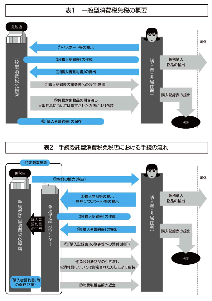 消費税免税店の2つのタイプ消費税免税店には、「一般型消費税免税店」と「手続委託型消費税免税店」があります。まず、それぞれの概要をお話します。「一般型消費税免税店」は、免税店を経営する事業者が外国人旅行者などの非居住者に対し、一定の方法で販売する場合には、消費税が免除されるというものです。その販売場(売場)において、免税手続きが行われます。一般型消費税免税店の許可は、その納税地を所轄する税務署長の許可を得なくてはなりません。 外国人といっても、日本国内の事業所に勤める者、6ヵ月以上日本に在住する者は該当しません。免税の対象となるのは、1日の一般物品の販売合計額が1万円を超えること、もしくは消耗品(食品類、飲料、タバコ、薬品、化粧品、その他)の合計が5000円を超え、50万円までであることとなります。ただ、事業用、販売用として購入する場合は対象外です。 手続きは、免税店側で購入記録表を作成し旅券に添付して割り印します。購入者は出国の際に購入記録表を税関に提出、国外に持ち出します。 「手続委託型消費税免税店」は、商店街、ショッピングセンター、テナントビルなどの特定商業施設内で、免税販売手続きを免税手続きカウンター設置する事業者に代理させることができるというものです。免税手続きカウンターで合算金額を管理している場合、同一の特定商業施設内であれば、合算額が下限金額(前述価格)を超えていれば免税の対象になります。 つまり、商店街振興組合や事業協同組合、大規模小売店舗、一棟のファッションビルなどで、定められた区域または建物の中に免税カウンターが設置されていれば、店舗を買い回りした合算で免税の対象になるということです。 手続きの流れとしては、まず特定地域ないし商業施設内の店舗(手続き委託型消費税免税店)で、税込みで販売し、免税手続きカウンターで手続き後、返金を行います。 ![]() 免税店になるための手続き免税店になるためには、どんな手続きをすればよいのでしょうか。これも「一般型消費税免税店」と「手続委託型消費税免税店」に分けて解説します。「一般型消費税免税店」は「輸出物件販売場許可申請書(一般型用)」に、以下の書類を添付して申請します。 @ 売場の見取り図 A 税販売手続きを販売員に周知させるための資料(マニュアルなど) B 免税販売の手続きを行う人員の配置状況が確認できる資料 C 申請者の事業内容が確認できる資料 D 販売場の取扱商品が確認できる資料(商品リストなど) E 許可を受けようとする販売場において作成する購入記録票のサンプル 一般型消費免税店として許可を受けるためには、次の要件を満たすことが必要です。 @ に国税の滞納(その滞納額の徴収が著しく困難であるものに限る)がないこと、輸出物品販売場の許可を取り消され、その取り消しの日から3年を経過しない者でないこと、その他輸出物品販売場を経営する事業者として特に不適当と認められる事由がないこと A 現に非居住者の利用する場所または非居住者の利用が見込まれる場所に所在する販売場であること B 免税販売手続きに必要な人員を配置し、免税手続きを行うための設備を有する販売場であること では次に、「手続委託型消費税免税店」についてお話しします。免税販売手続きを免税手続きカウンターに代理させる方法です。 ほかの事業者が経営する販売場で免税手続きを代理する事業者は、自身の納税地を所轄する税務署長の承認を受け、承認免税手続き事業者となる必要があります。また、その販売場内にある各販売場(店舗)の事業者は、それぞれ納税地を所轄する税務署長の許可を受ける必要があります。そのため、「手続き委託型消費税免税店」と委託する事業者の間で代理契約を結び、申請書とともに契約書の写しを税務署に提出しなくてはなりません。 この方法で、特定商業施設(商店街、ショッピングセンター、テナントビル)に「手続委託型消費税免税店」を設置することができます。隣接または近接した商店街を一つの承認免税業者が行う場合、連携したイベントなどを行った事業報告書、その実績がない場合は、この制度を連携して行うメリットなどを記載した理由書を申請の際に添付します。 商店街などで、免税手続きカウンターを導入する場合のモデルケースを考えてみましょう。まず、すでに免税販売手続きを行っている百貨店やGMSが受託するケースがあります。また、外国人対応が得意なお店やコンビニ・配送業者などの人やモノが集まる施設に設置する場合もあります。中小企業庁の地域商業自立促進事業補助金や、内閣官房まち・ひと・しごと創生本部の交付金などを活用して、決済端末やWi−Fi機器などをそろえることもできます。 ![]() 購入記録票と購入誓約書免税の手続きについて解説を加えたいと思います。一般物品は1万円を超えるもの、消耗品は5000円から50万円までというのはお話ししました。消費税免税店は、免税販売をする際に「購