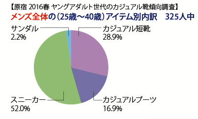 ヤング世代のメンズでは、再びスニーカーの着用率が7割を超え、90年代のスニーカーブームに迫る勢いとなっている。では、その上の世代の大人たちのカジュアルスタイルでは、どんなシューズが人気となっているのだろうか? いくつになってもストリート感覚を持ち続ける人が多いと言われる、今の大人世代の間では、どんな靴傾向が見られるのか?今回のウォッチングは、25〜40歳のヤングアダルト世代の男性に限定し、原宿駅前で春のカジュアル靴傾向を探ってみた(ビジネススーツは除く)。![]() (アジアリング/高橋悟史) 【アイテム別内訳】 スニーカーの着用率は半数以上 ヤングアダルト世代はカジュアルウエアで通勤する人も多く(調査は平日実施)、革靴の割合が高いはずだが、今回の調査ではスニーカーの着用率は半数を超えている。ジャケットスタイルやカジュアルスーツで、バルカナイズやクラシックランニングなどを合わせる人が増えており、人気のスニーカーがオンシーンにも広がっていることが推測される。また、靴店でも大ヒットとなった、ドレープブーツやドライビングシューズの着用率が高いところが、この世代の大きな特徴だ。 【カジュアル短靴・アイテム別ベスト5】 オン・オフ兼用できる「オックスフォード」や「ドレスカジュアル」 この世代でもデニムやスウェットなどのアメカジ&スポーツの着こなしが人気となっているが、革靴では「オックスフォード、ポストマン」などのトラッド短靴と、ソフトロングノーズの「ドレスカジュアル」が主流となっている。ジーンズやチノパンだけでなく、ジャケパンスタイルやスーツスタイルでも兼用できるアイテムの着用率が高い。 例年であれば、デッキシューズやドライビングシューズ、メッシュスリッポンの素足カジュアルが台頭する時期だが、今年はスニーカー感覚ではける「スポーティーカジュアル」の着用率が高まっている。