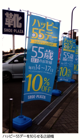 現在、「ハッピー55」という用語を周知している段階だが、HPやLINEで知らせているほか、店頭駐車場にブルーの幟を掲げてアピールしている。
