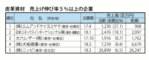 靴・バッグ関連の資材製造・卸47社の売上げ合計は1500億円、前期比98・4%で、靴小売に次いで低い下げ幅となった。前期を上回った企業は13社、前期割れは31社で、好不調企業の差が大きかった。前期を上回った企業の内、2ケタ増加が2社、5%以上は5社にとどまった。 |