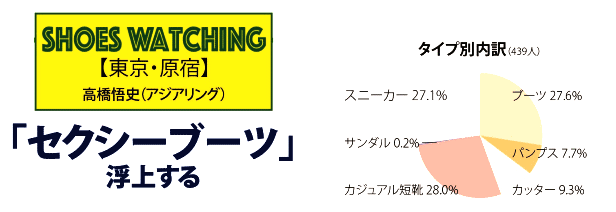 12月入り、やっと寒さが本化かしてきた。厚手のアウターとブーツが本格化する時期だが、ヤングトレンドのブーツ傾向はどうなっているのか? 東京・原宿のラフォーレ前交差点でトレンド層の女性(16〜29歳)に限定し、彼女たちのブーツ傾向をウォッチングした。 全体傾向 分散化傾向にある人気タイプ 初秋からカジュアル短靴の着用は増えており、チャンキーヒールを使用したヒールアップのオックスフォードやローファー、スーパー厚底のオックスフォードなどの短靴が、一大トレンドとなっている。アバンギャルド色の強いカジュアル短靴を、女の子らしいスカートやワンピースにも組み合わせるのが大きな特徴。 アパレルでは、ミニスカートやショート丈のワンピースが復活しているが、そこにあえてカジュアル短靴やショートブーツを組み合わせて、足の露出を高める着こなしが、ヤングでは大人気となっている。全体ではブーツの着用率は増えているものの、「カジュアル短靴」と「スニーカー」の着用率はほぼ同率となった。 オーバーニーとストレッチが復活 ブーツのタイプ別と丈の長さ別を調べてみた。 初秋では、「ドクターマーチンタイプ」に人気が集中していたが、寒くなりチャンキーヒールを使用した高寸の「サイドゴアブーツ」や「レースアップブーツ」へ傾向が移っている。 ギャル全盛期時代の「厚パン+高寸」を彷彿させるブーツも登場しており、セクシーなブーツが再燃している。その流れで、「オーバーニー」や「ストレッチ」のエレガンスブーツも再登場。ストレッチはベロア調やスエード調の素材アレンジが新鮮。 一方、オーバーニーブーツは、ロングニットやロングコートと組み合わせて、レイヤード感を楽しむのがポイントとなっている。 ![]() ![]() ![]() ![]() ![]() ![]() ![]() ![]() ![]() |