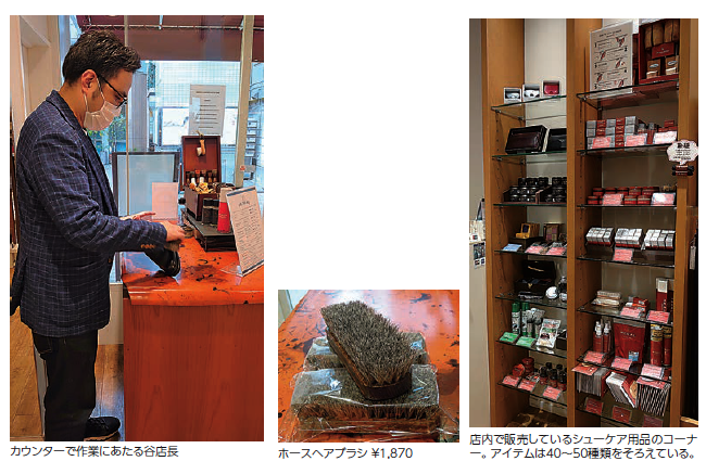 ![]() 「ケアステーション」と「シャインスタンド」設置 リーガルコーポレーションは2015年2月からシューメンテナンスのプロジェクトとしてシューケアサービスをスタートしている。リーガルシューズの直営店内に「シューケアステーション」コーナーを設け、都内ビジネス街での店舗を皮切りに、靴磨きならびにキズ補修などのメンテナ ンスに対応できる店を増やしている。22年10月現在、「シューケアステーション」があるショップは43店舗になった。シューケアサービスは利用者の好評もあり、21年8月からは磨きに特化した「シューシャインスタンド」を直営店すべてに開設した。シューケアサービスが提供できる店舗数はトータルで132へと拡充した。これによりシューケアサービスの業績は好調で、昨年の「シューシャインスタンド」開設後は、この1年(21年8月〜22年9月末)でシューケアサービスの売上げが2倍以上になっている。 履きおろし前の「プレキュア」を推奨 「リーガルシューズ吉祥寺店」は18年に「シューケアステーション」を併設し、従来の靴販売に加え、磨きやキズ補修などの有料サービスも行っている。サービスの提供をはじめてから4年目になり、メンテナンスメニューの存在は地域や利用客のあいだでだいぶ浸透してきた。 ![]() おもな利用者はリーガルシューズを買い求めに訪れる来店客が中心になるため、靴の販売と同時にサービスを勧めるなどしながら、メニューを磨き上げてきた。サービス開始後にプラスしたのが、レザーのホワイトスニーカーを中心にしたスニーカーのメンテンスメニューだ。ビジネス用途などのドレス系のシューズに留まることなく、時代やライフスタイルの変化にも対応している。 靴販売店ならではの強みは、靴の購入者にその時点でシューケアサービスの魅力を伝えながらセールスできること。とくに吉祥寺店の谷店長は、履きおろし前に行うプレメンテナンスメニューの「プレキュア」サービスを積極的に勧めている。 プレキュアは履きおろし前のシューズにベースメイクを施すもの。仕上げ材をいったん落としてから革の毛穴を広げ、そこにクリームを入れることによって繊維にオイルを浸透させ、履き馴染みを良くするという効果を生み出す商品だ。 「触るだけでもわかりますが、新品の状態の革靴はなにもしないと固く感じます。製造してから時間を経ると、油分が徐々に抜けてきますから。履く前に油分を入れることで、革靴が持つ本来の履き心地の良さを、最初から得られるようになります」 プレメンテナンスのサービスは好評で、リーガルシューズ全体でもシューケアの全メニューのうち6割以上の売上げを占めている。吉祥寺店においても固定客を徐々に増やす効果ももたらしている。 「毎回靴を買っていただいて、その後にお手入れでお持ちいただく方が1〜2割くらいは増えました。またビジネスシューズをお買い求めいただいたお客さまに、シューケアのご説明をすると『プレメンテナンスとかプレキュアというのを最初にやったほうがいいんだね』と、お客さまから商品を求められます」(谷店長)。 ![]() FC加盟店でもメンテナンスを リーガルシューズは、潜在的な靴購入者との接点の拡大や、靴を履いている人の満足度の向上を重視している。たとえば10分程度でブラッシングによる汚れ落としと、クリームを使って磨きを行う「クイック」というメニューがあるが、これは予約なしでも利用できる。店が営業中であれば気軽に訪れて利用できるだけでなく、他社製の靴を履いている人でも(特殊な仕上げなどがない場合には相談に応じて)サービスが受けられるようにした。 リーガルシューズとのきっかけづくりという点では、従来にない間口の広げ方を実現していることになる。メンテンスを機に店舗やスタッフに対する親近感を抱いてもらえれば、いずれ靴を含めたアイテムの顧客になったもらえる。靴の購入もネット利用が増え、実店舗は苦戦を迫られている。それだけにネットではできないような、メンテナンスのサービス提供は強みだ。リーガルコーポレーションとしては、直営店は「シューケアステーション」「シューシャインスタンド」のどちらかを開設ずみのため、今後はシューケアサービスをより広げるべく、リーガルシューズのフランチャイズ加盟店への水平展開にも注力したいとしている。 武蔵野市吉祥寺本町2-19-7 TEL:0422-23-1830
