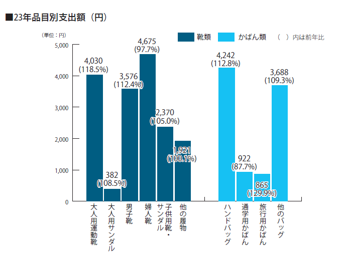 ![]() 靴1万6900円、バッグ9700円――2年連続で前年をクリア、かばんは19年を上回る総務省統計局が毎月統計をとっている、2人以上の1世帯家族の品目別支出額「家計調査報告」の23年の年間集計が発表された。靴は3年連続で前年を上回ったものの、伸び率は前年をやや下回った。バッグは2年連続で前年を上回り、19年実績を超える結果となった。